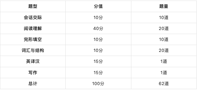 河北地區(qū)學(xué)位英語(yǔ)2022年下半年考試新增了完形填空題型,目前試卷共6個(gè)題型包括會(huì)話交際、閱讀理解、完形填空、詞匯和語(yǔ)法、英譯漢和短文寫作。
