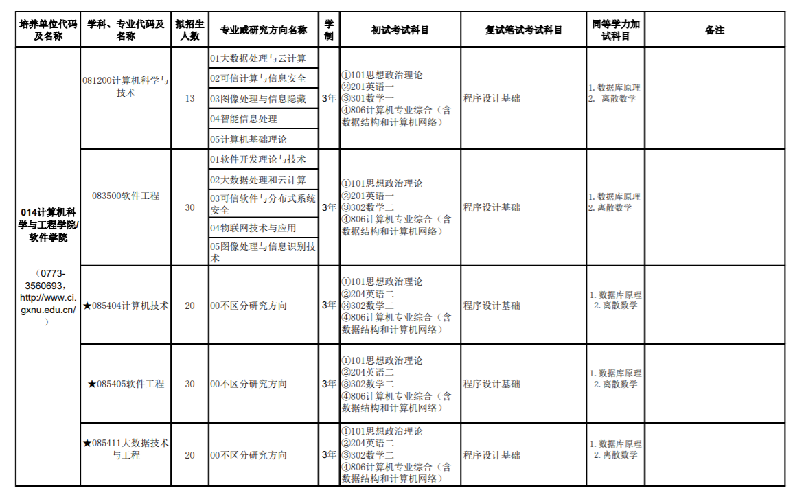 2023年廣西師范大學(xué)計(jì)算機(jī)相關(guān)專業(yè)招生計(jì)劃錄取113人(全日制),專業(yè)方向及初試科目詳見下圖: