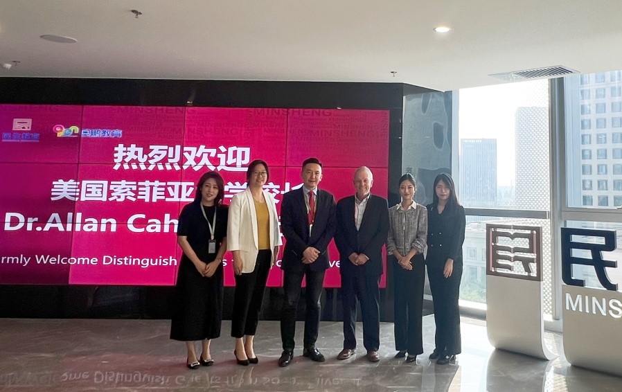 2023年9月15日下午,美國索菲亞大學名譽校長Dr.Allan Cahoon一行到訪民生教育集團進行了交流座談。民生教育集團執(zhí)行董事、總裁左熠晨對Dr.Allan Cahoon一行的到來表示歡迎。