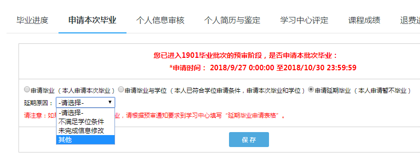 提交延期畢業(yè)申請后,平臺會讓學(xué)生選擇延期畢業(yè)原因: