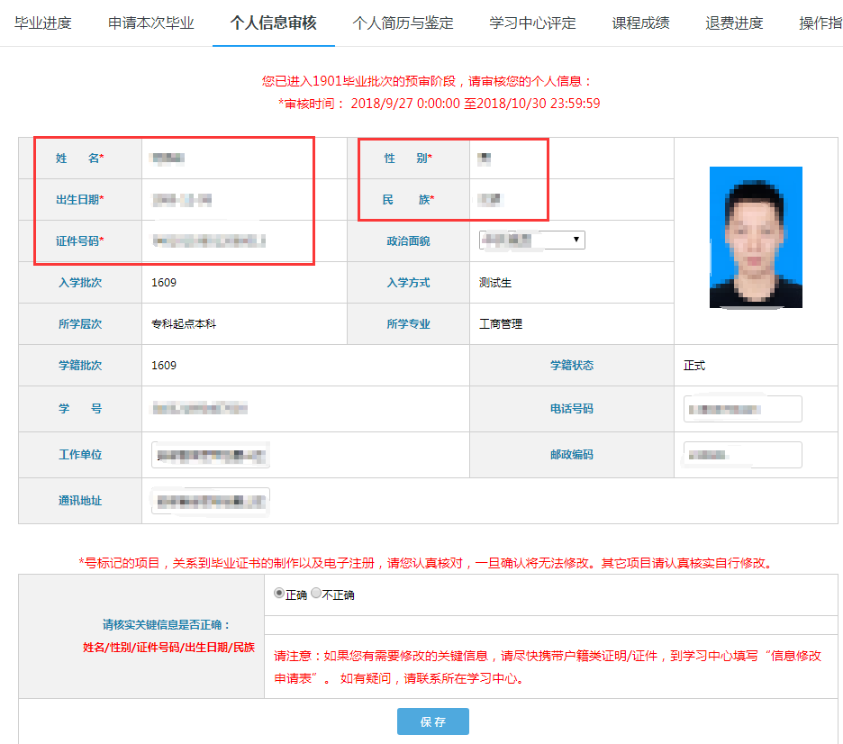 1)“姓名”、“性別”、“證件號碼”、“出生日期”、“民族”信息如核對無誤,請選擇“正確”;