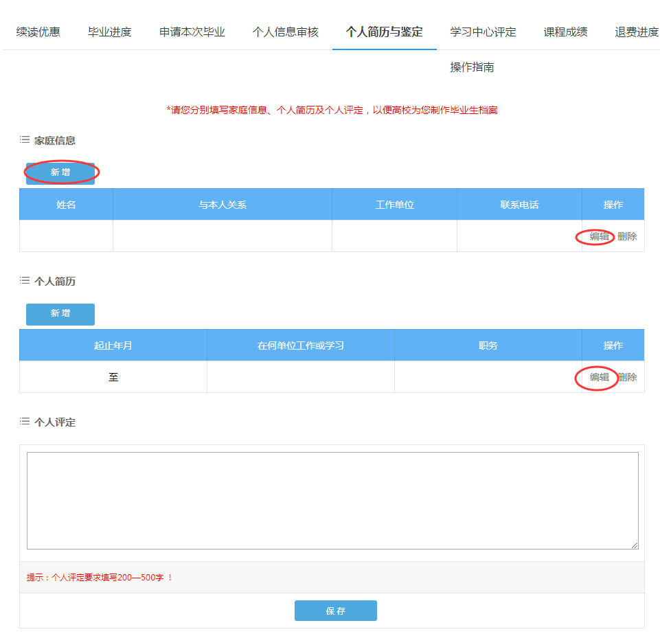 學(xué)生填寫個人簡歷與鑒定時應(yīng)參照畢業(yè)預(yù)審工作通知要求填寫;如預(yù)審?fù)ㄖ獰o要求,【家庭信息】及【個人簡歷】建議至少填寫2條,【個人評定】建議至少填寫200字。