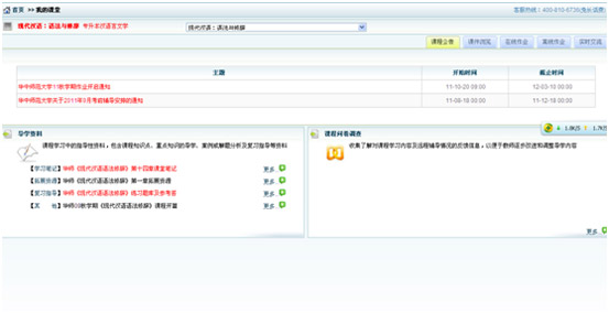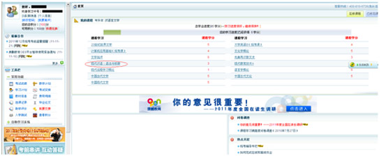 ? ? ? ?  使用你的用戶名、密碼登錄學(xué)生中心首頁。在該頁面的中部“我的課程”專區(qū)下點(diǎn)擊“課程學(xué)習(xí)”欄目下任何一個(gè)課程(以《現(xiàn)代漢語:語法與修辭》為例),進(jìn)入課程學(xué)習(xí),如圖示13-1